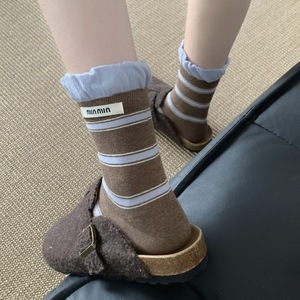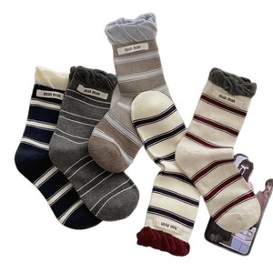 韩系泡泡口条纹秋冬中筒袜子无骨棉袜百搭ins复古堆堆女袜