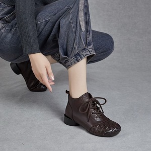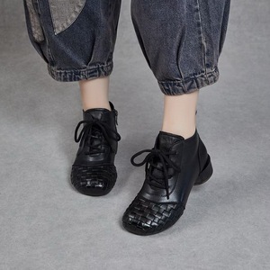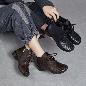 龍林2025秋冬单靴手工真皮复古妈妈及踝靴软底编织带英伦风马丁靴