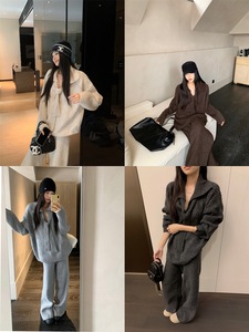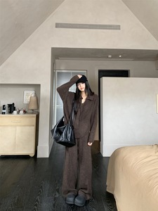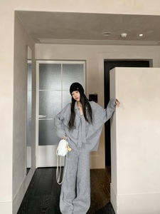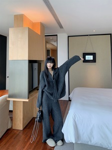 慵懒风套装披肩米白色长袖毛衣针织衫女秋季直筒休闲裤长裤三件套