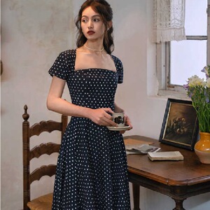 法式复古大方领波点连衣裙高腰显白显瘦赫本风A字收腰文艺大摆裙
