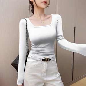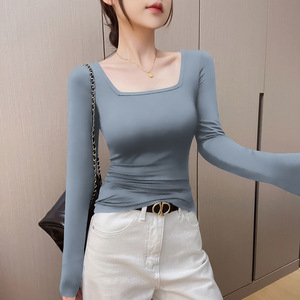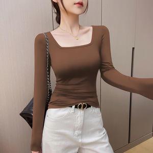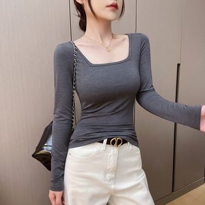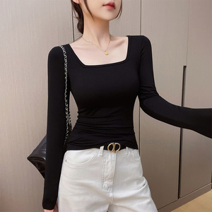 法式方领莫代尔长袖t恤女秋冬新款黑色简约修身内搭洋气打底上衣