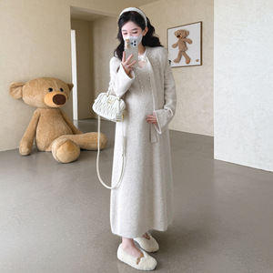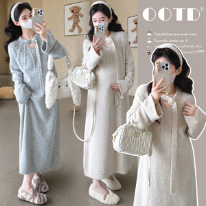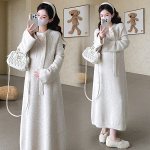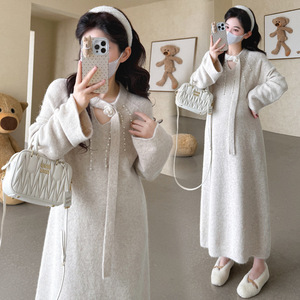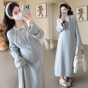 孕妇裙秋冬韩版时尚毛衣钉珠花朵孕妇连衣裙针织孕期连衣裙