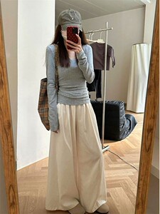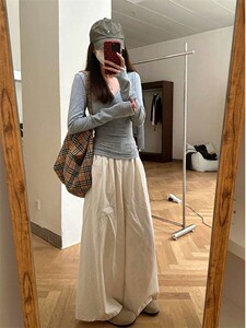 灰色V领美式辣妹正肩长袖T恤修身打底衫百搭收腰基础款外穿上衣女