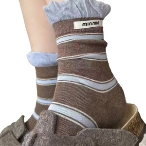 韩系泡泡口条纹秋冬袜子女中筒复古百搭布标罗口拼色堆堆袜学院风