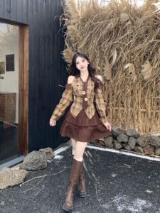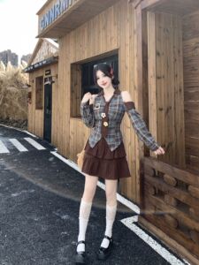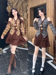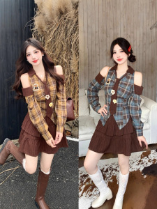大码女装美式复古露肩格子上衣女早秋高腰a字短裙两件套套装
