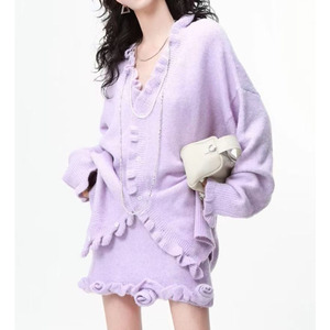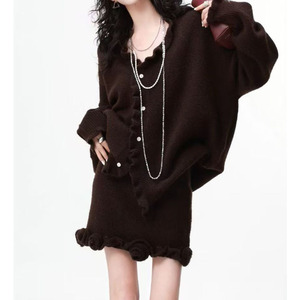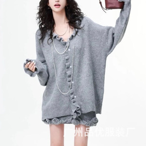 法式寻梦山茶慵懒风宽松木耳边针织上衣+短裙两件套装2025秋季新