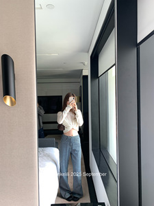 板栗可可9.8/20点'复古航线'蓝色绑带条纹牛仔直筒裤女