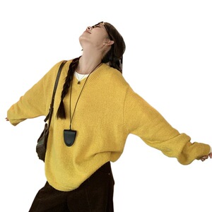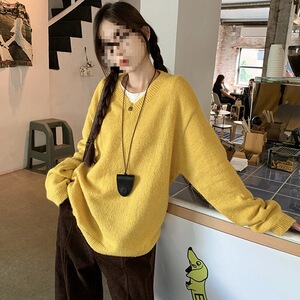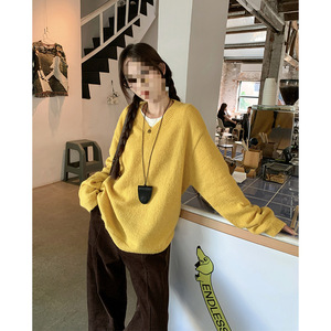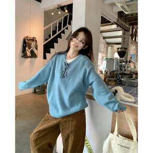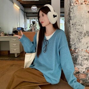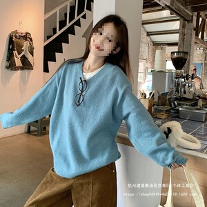 韩系慵懒感湖蓝色v领套头毛衣女秋冬季宽松加厚浣熊绒针织衫