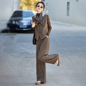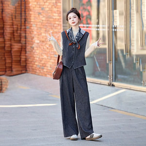 时髦休闲风三件套裤2025新款秋季超火马甲小衫气质丝巾长裤套装女