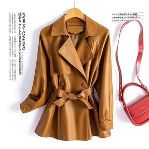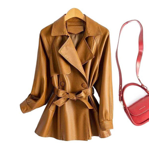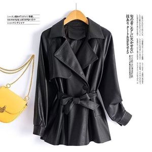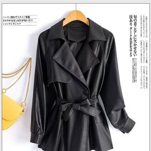 新款系带海宁收腰洋气皮衣2025春秋中长款外套韩版气质宽松皮风衣