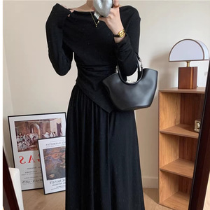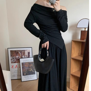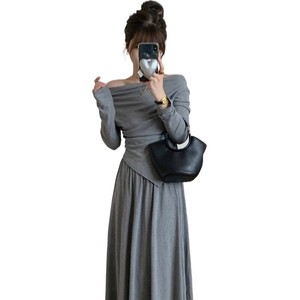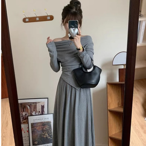 欧美跨境亚马逊一字肩不规则上衣半身裙灰色休闲套装女秋冬两件套