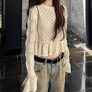 针织开衫上衣女秋季法式复古风镂空钩花荷叶边长袖设计感短款毛衣