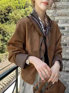 复古丝巾麂皮绒外套女短款2025秋季新款时尚洋气减龄格子拼接夹克