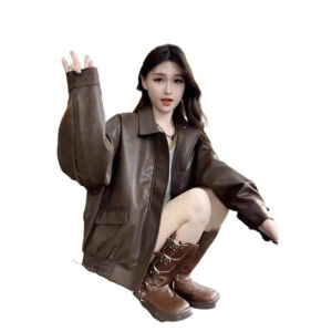 大码酷帅气黑色pu皮衣女秋冬美式复古设计感休闲宽松机车夹克外套
