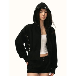 秋季新款美式小众设计钉珍珠短款连帽外套女复古修身黑色夹克灰色