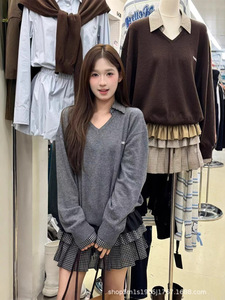 2025秋冬新款韩系假两件拼接衬衫领针织衫女宽松休闲减龄毛衣套头