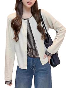 大码微胖休闲灰色条纹长袖T恤女秋季韩系穿搭胖MM显瘦假两件上衣