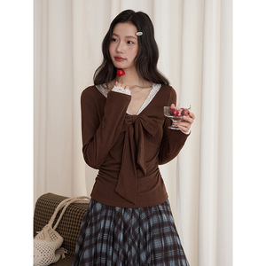 【纯欲氛围】歌铭法式复古蕾丝花边收腰褶皱上衣秋季新款T恤N616C