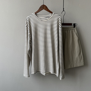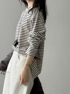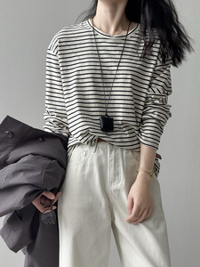 言双 韩系黑白条纹正肩长袖T恤女 秋季内搭打底衫慵懒风上衣716
