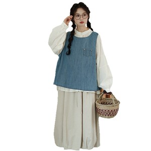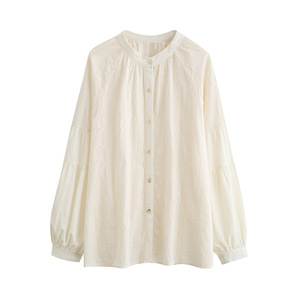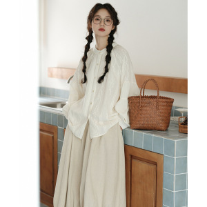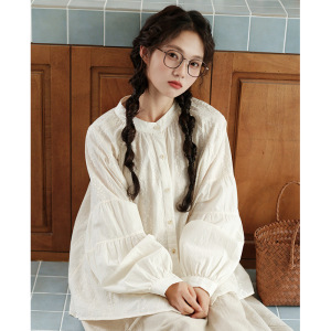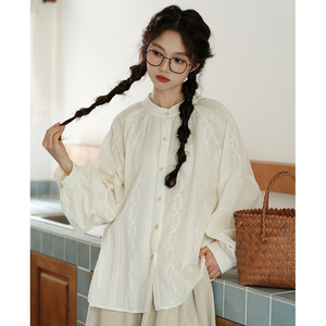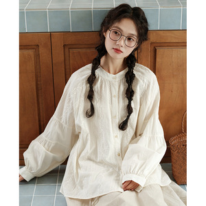 日系文艺复古圆领提花刺绣纯色衬衫女学生宽松大版长袖衬衣上衣