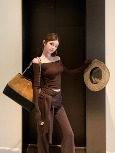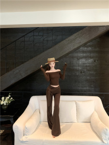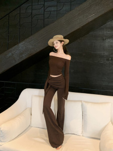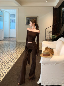 女士衣服套装高级感气质辣妹一字肩长袖上衣秋季系带微喇休闲长裤