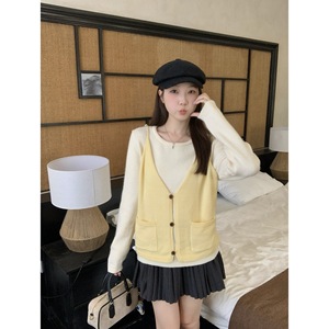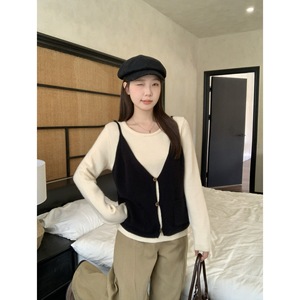 实拍2025秋胖mm大码韩系撞色假两件针织衫宽松慵懒长袖毛衣68699