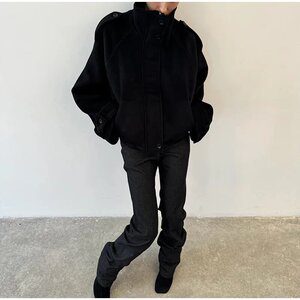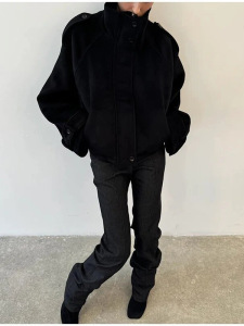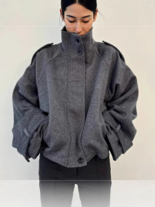 跨境欧美高品质气质灰色立领毛呢外套女士秋冬宽松休闲夹克