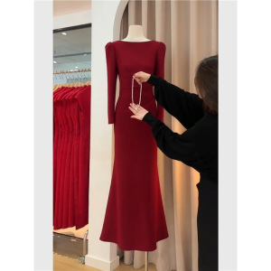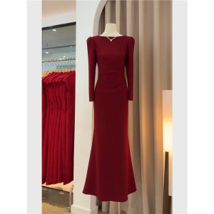 深圳南油红色掐腰鱼尾宴会长袖连衣裙秋季高级感穿搭订婚礼服长裙