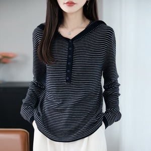2025年早秋新款精纺羊毛连帽针织衫长袖女纽扣拼色条纹打底衫上衣
