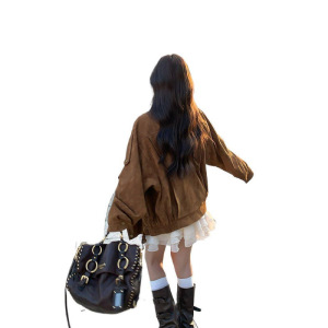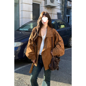 麂皮绒机车外套2025秋季复古美拉德休闲宽松慵懒翻领廓形感时尚款