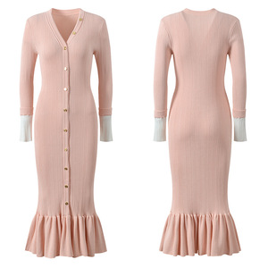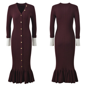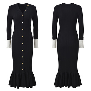 跨境外贸欧美女装V领单排扣鱼尾裙2025大量现货深圳南油2025秋冬季新款高端优质跨膜毛衣连衣裙批发