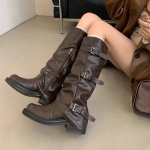 骑士靴皮带扣百搭牛仔厚底新款堆堆靴女感2025裤管秋冬长筒靴