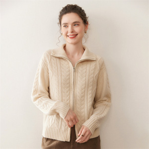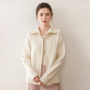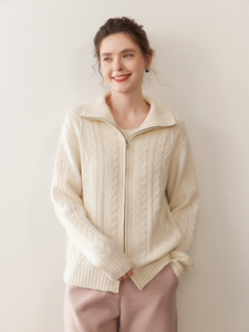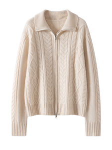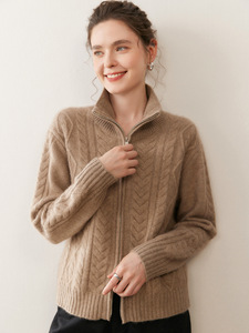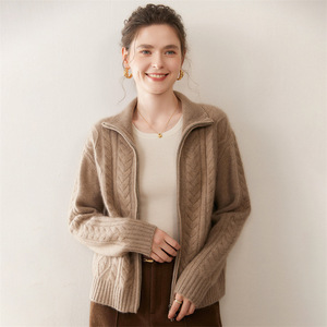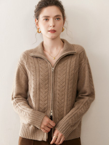 立领五针厚绞花重磅山羊绒开衫女复古拉链款长袖毛衣外套女宽松