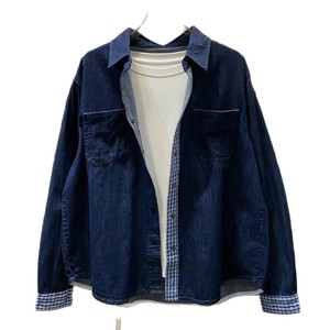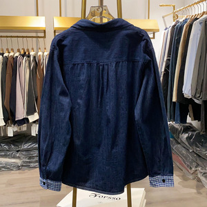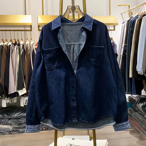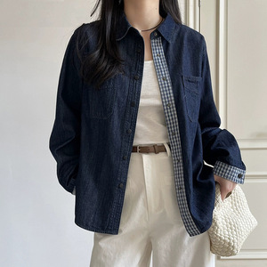 日韩深蓝色格子拼接天丝牛仔衬衫女春秋复古宽松显瘦上衣外套女装