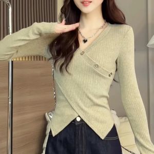大码不规则V领开叉甜打底衫女秋冬新款修身显瘦遮肉别致内搭上衣