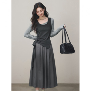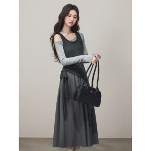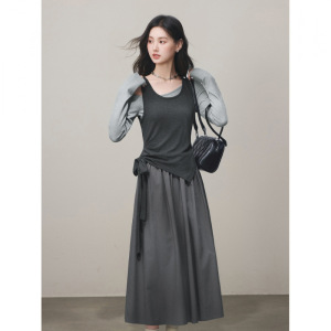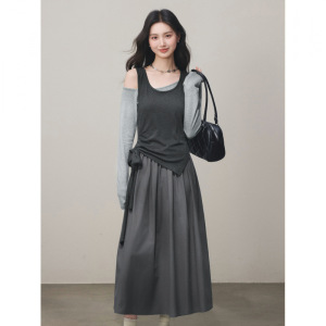 设计感不规则绑带背心搭斜肩拼接连衣裙两件套女修身显瘦露肩套装