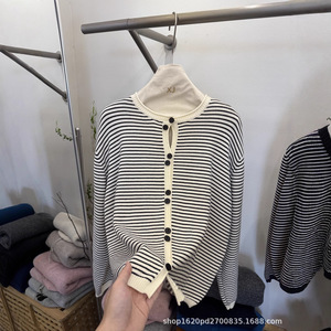韩系圆领条纹撞色针织开衫女2025秋冬新款宽松慵懒风毛衣外套上衣