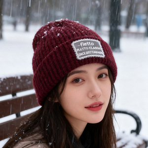C5621蕾丝边透明fletto标毛线帽YC 酒红