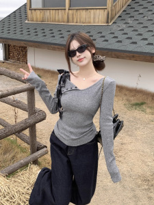 大码女装灰色一字肩针织打底衫女早秋chic甜辣露肩蝴蝶结短款上衣