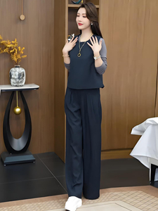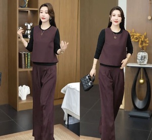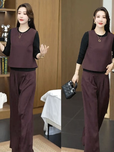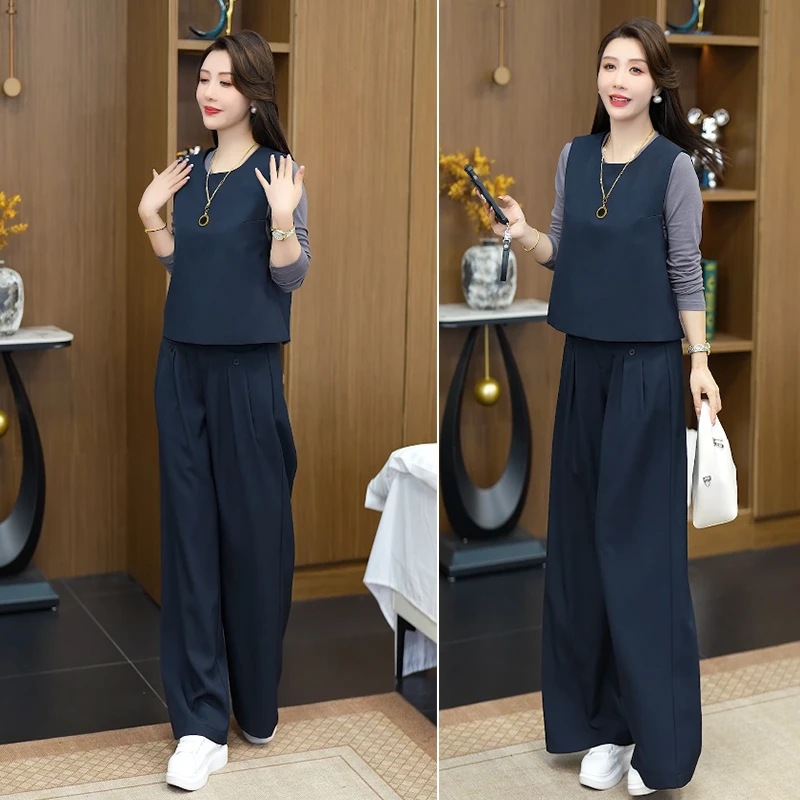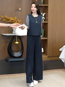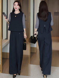 时尚休闲套装女秋装新款洋气显瘦马甲内搭圆领打底衫阔腿裤三件套