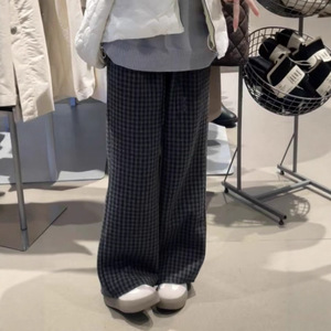 秋冬季大码胖高腰宽松休闲慵懒长裤老钱风复古毛呢格子阔腿裤女