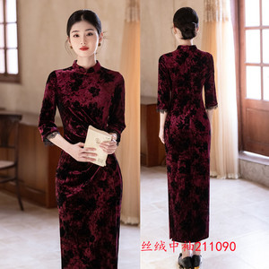 婚礼妈妈旗袍显瘦婚宴丝绒长款旗袍2025秋季新款时尚改良旗袍