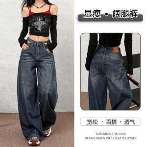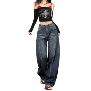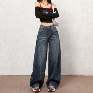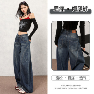 美式复古弯刀牛仔裤女2025秋季新款宽松阔腿压皱猫抓痕拼接设计感