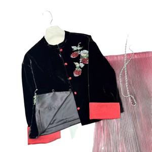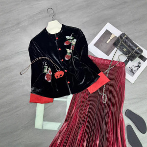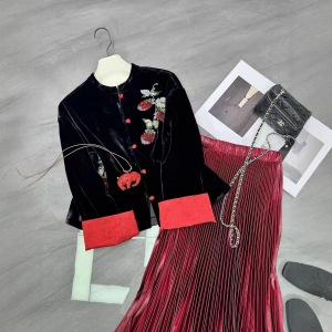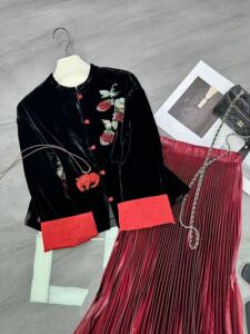 2025新品篙端时尚新中式真丝丝绒订珠外套复古盘扣立领上衣不退换