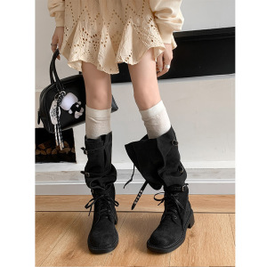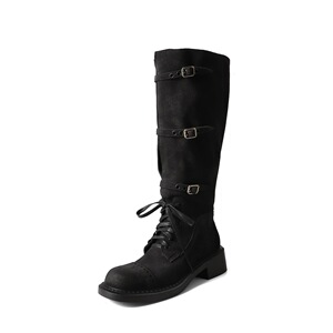 废土风~做旧磨砂直筒英伦风高筒靴皮带扣系带粗跟长靴