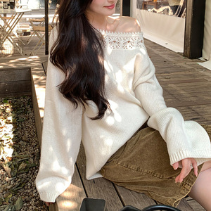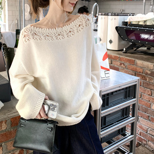 美利奴羊毛镂空花边一字领针织衫女秋长袖宽松慵懒上衣