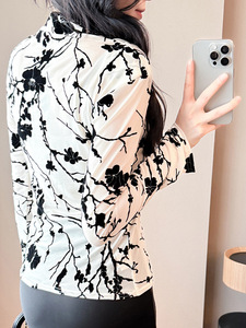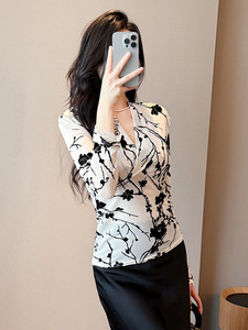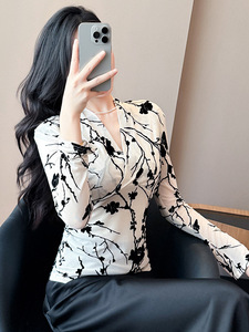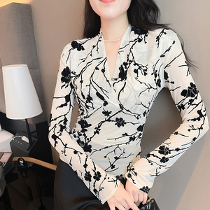 气质网纱印花打底衫女秋冬妈妈装碎花时尚洋气交叉v领长袖t恤上衣