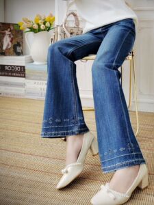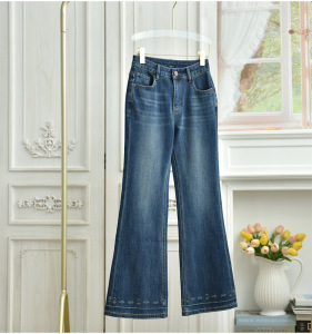 爆款十字绣花钉珠微喇牛仔裤中高腰修腿长裤喇叭裤女春秋新款时尚
