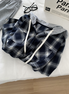 2025秋季宽松连帽衬衫外套女慵懒BF风复古宽松显瘦长袖格子上衣