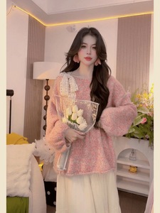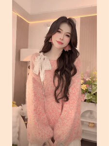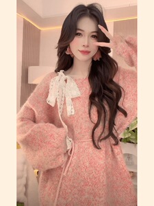 温柔风粉色蕾丝蝴蝶结针织开衫女2025秋季新款宽松甜美设计感上衣